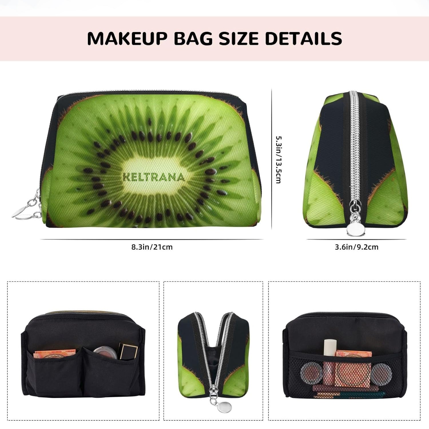 Keltrana Kiwi Slice Leather Makeup Bag – Waterproof Portable Travel Zipper Pouch for Women & Girls